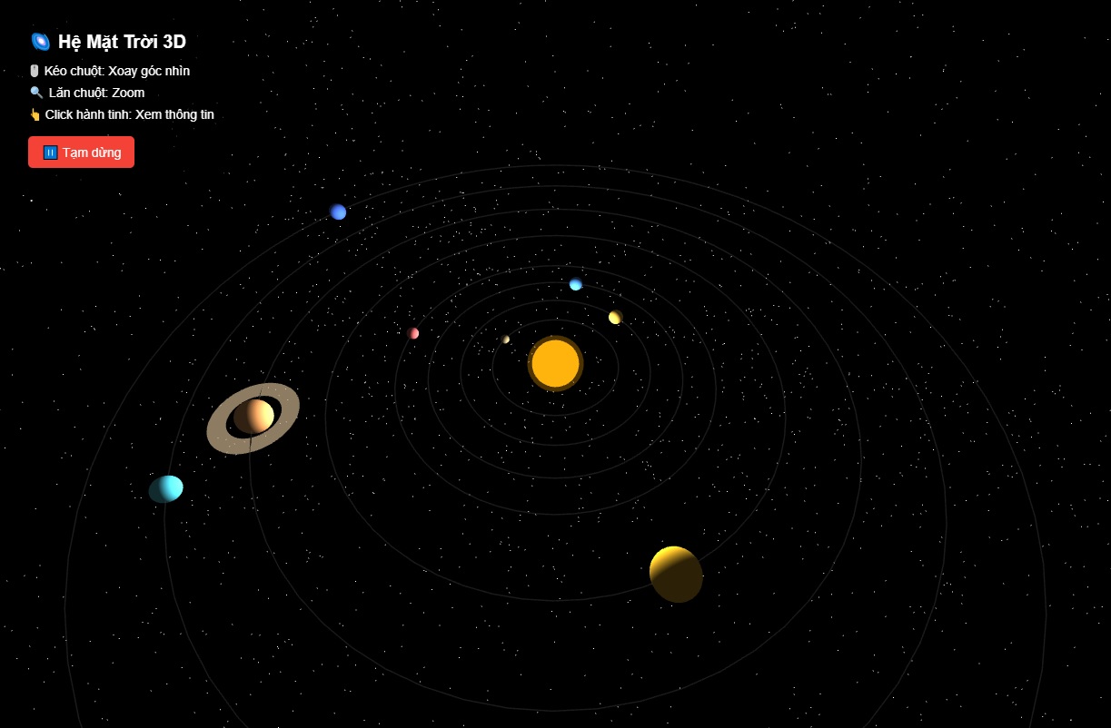 Một trong những ví dụ tiêu biểu là mô phỏng Hệ Mặt Trời 3D – nơi các hành tinh quay quanh Mặt Trời theo đúng quy luật vật lý.