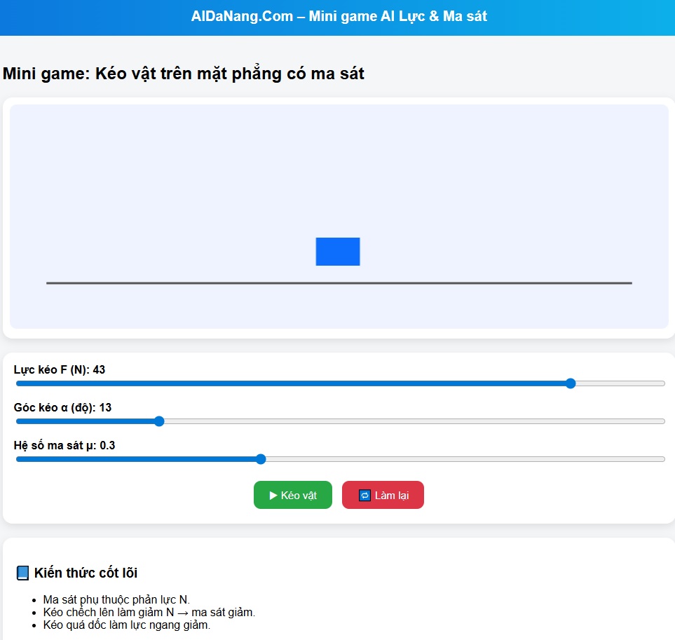 AIDaNang.com đã xây dựng một demo mini game Vật lý cho phép học sinh trực tiếp tương tác với lực kéo và ma sát trên mặt phẳng ngang.